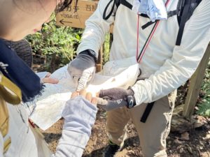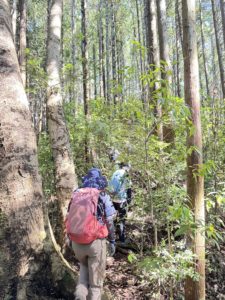 思わずはっきりとした巻道へ行ってしまいそうですが、ここは藪をかき分けて尾根を進みます。地図と地形、コンパスを確認して進みます。受講者から「地図とコンパス渡されて、ひとりで行ってこいと言われても、歩ける自信がない。」という素直な感想が出てきました。だから、ルートファインディングは先頭を歩く人に任せず、全員で確認しながら歩きます。