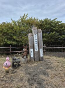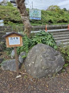 駅前の人の顔に見える「ふく石」。ここから酒匂(さかわ)川に向かいます。