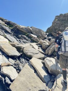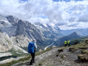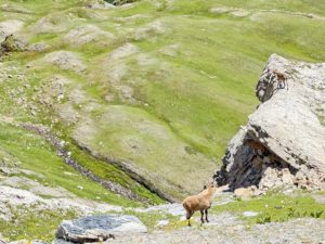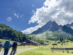 トリアン村の小屋からスタート。岩肌にはアイベックスか何かがいた。ヨーロッパにはオオカミがいるそうだが、私たちのところには出てこないそうだ。他に野生動物は、マーモットの声や姿を見たぐらいだ。どんどん登っていくと、バルム小屋が見えた。TMBも終盤となった。