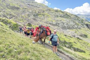ボンノム峠の先で、ラバさんとスライド。ロバと馬のMIXの彼らは1代限りだという。口回りや耳がロバで身体が馬のようだ。日帰り装備で、ラバさんにその他の荷物を回送してもらうというシステムがある。ワタクシたちは、前半の3泊4日分を担いでいる💦