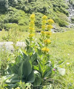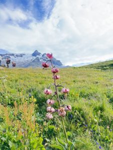 抜けるような青空。花々に足留めをくいながら、氷河で削られた谷を見ながら歩く。急登を息をあげながら登ると、ボンノム峠だ。