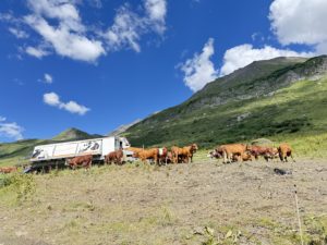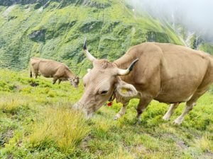 ボーフォールチーズ小屋で、チーズを買ってチーズ休憩。ここで、バス組と歩く組に分かれた。歩いていると搾乳車がいて、牛さんたちが自分で搾乳車の中に入って行く。搾乳が終わった牛さんは、左の方に出ていく。登山道は牛さんの柵の中にあるので、ワタクシたちは張られたワイヤーを外して出ていく。モッテ小屋に到着。