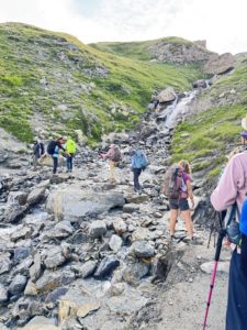 雪渓?氷河??歩きの先は沢渡渉だ。日本人ガイドとフランス人サブガイドの指示でひとりずつ渡った。
