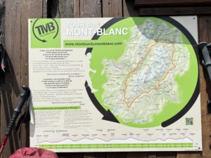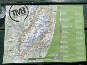 ツールドモンブラン(以下TMB)の地図が出て来た。いよいよスタートだ! が、いきなりの樹林帯のガレ急登。ガイドが一番好きじゃないエリア1時間と言っていた。