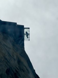 エルブロンネ(3466m)から、3連ゴンドラでエギュードミディへ上がる。3連ゴンドラが可愛い! この辺りは氷河なので鉄塔を立てられず、岩にアンカーを打ってワイヤーで固定しているそうだ。エギュードミディはクライミングができるそうで、アンカーが打ち込んであるそうだ。