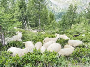 だみ声の「めえ~」が聞こえたと思ったら、ヒツジさんの群れがいた。ヒツジさん優先なので、待ったり避けたりしながら身を小さくして進む。山小屋の脇を通って、先の川沿いで休憩。フランズ人のサブガイドは下着になって川に入ってクールダウン。ワタクシにも入れと誘うが、白人の体感はまねできない。