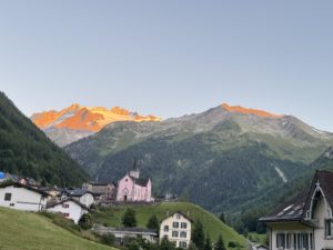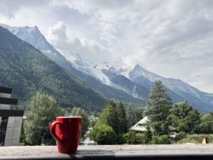 シャモニーの街の四つ星ホテル、ルプリウールシャモニーの部屋の窓から赤く染まるモンブランが見えた。時刻は21:20頃。ヨーロッパの夏は暮れるのが遅い。シャモニーの街を歩き、ディナーはガレットにした。
