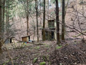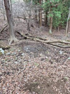 ムササビやリス、野ネズミ、カワネズミ、オオムラキなどの野生生物の観察小屋の跡とヌタ場です。ヌタ場にはカメラが設置されていました。イノシシやシカなどがやって来るのでしょう。