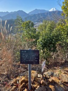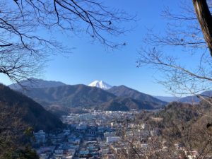 富士山展望台に寄ります。杓子山や尾崎山の向こうに富士山が見えました。眼下は都留市街です。