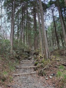 樹林帯の穏やかな登りです。途中から粉雪が舞いました。