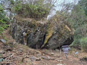 左は金太郎が手毬をして遊んだ手毬石です。 右は金太郎が母親の山姥(やまんば)と姥子(うばこ)温泉に湯治していた時の仮住まいの金時宿り石です。