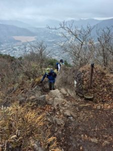 矢倉沢峠の分岐です。分岐を過ぎると岩場の道となります。振り返ると芦ノ湖が見えました。