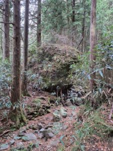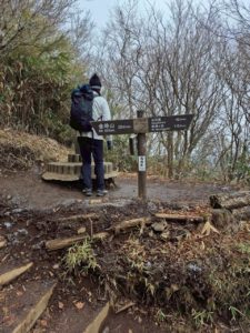 矢倉沢峠の分岐です。分岐を過ぎると岩場の道となります。振り返ると芦ノ湖が見えました。