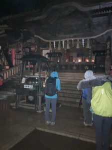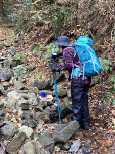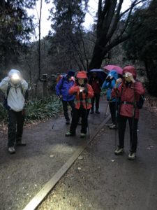 とうとう小雨がちらつき出し、日没ももうすぐです。雨具とヘッデンを装着して、再び歩き出します。