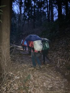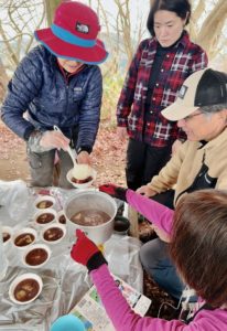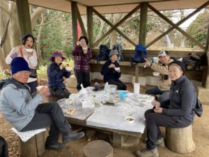 無事、高尾山口駅に到着して解散となりました。今回は、「おしるこ山行」となりましたが、みんなで担ぎ上げて作った温かいお汁粉を、ゆっくりと楽しくおしゃべりしながら食べられて良かったです。