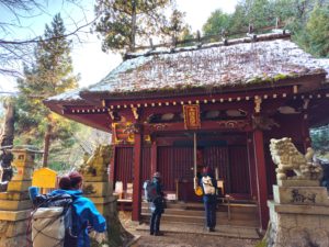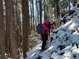 チェーンスパイクも使いながら雪道を進みます。祠があったので安全祈願🙏
