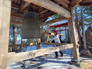 T美リーダーが今年1年の安全を祈願して鐘を一突き。