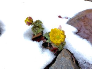 ロウバイが1輪、そして早咲きの福寿草が雪に耐えて咲いてました。