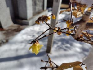 ロウバイが1輪、そして早咲きの福寿草が雪に耐えて咲いてました。
