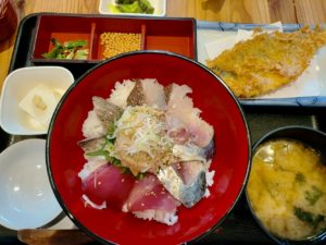 お楽しみの下山メシは、房総名物・なめろうの丼ぶりと黄金のアジフライ🐟🐟🐟