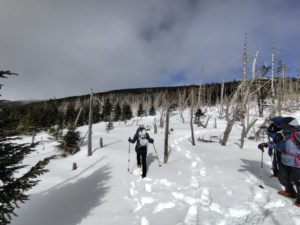 ツボ足で出発しましたが、傾斜がきつくなってきたのでアイゼン装着。