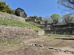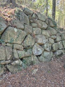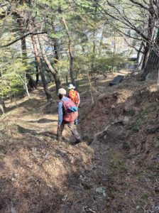 新田神社は新田義貞を祀っています。神社は金山城の実城(みじょう)と呼ばれる本丸にあり、裏手には石垣の跡が残っています。石垣は野面積(のずらづみ)という積み方です。続いて根本山・観音山と回ります。