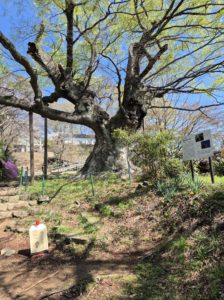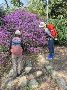 高さ16メートルの御城橋を渡り登ると樹齢800年の金山の大ケヤキがそびえています。金山山頂の新田神社にはつつじが咲いていました。